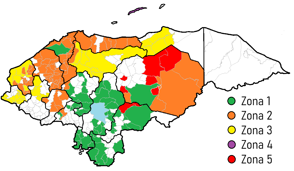 Francisco Morazán, San Pedro Sula, Choluteca, Comayagua (excepto Taulabé), El Paraíso (excepto Teupasenti y Trojes), La Paz (excepto Marcala), Valle y Juticalpa.